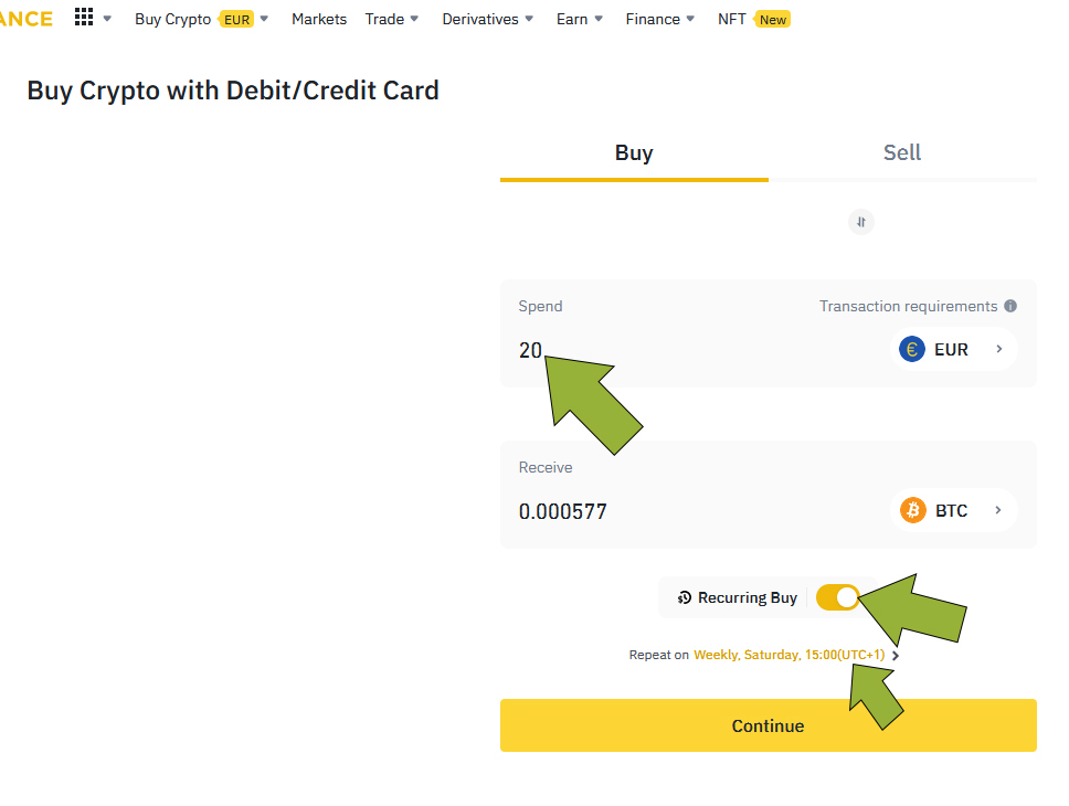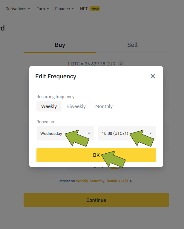 Check the ‘Recurring Buy’ option. Then select when the purchase shall take place. For me, personally weekly purchase is set, for Wednesday 15:00.